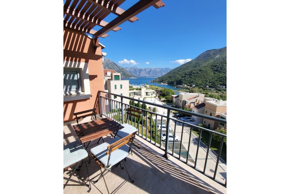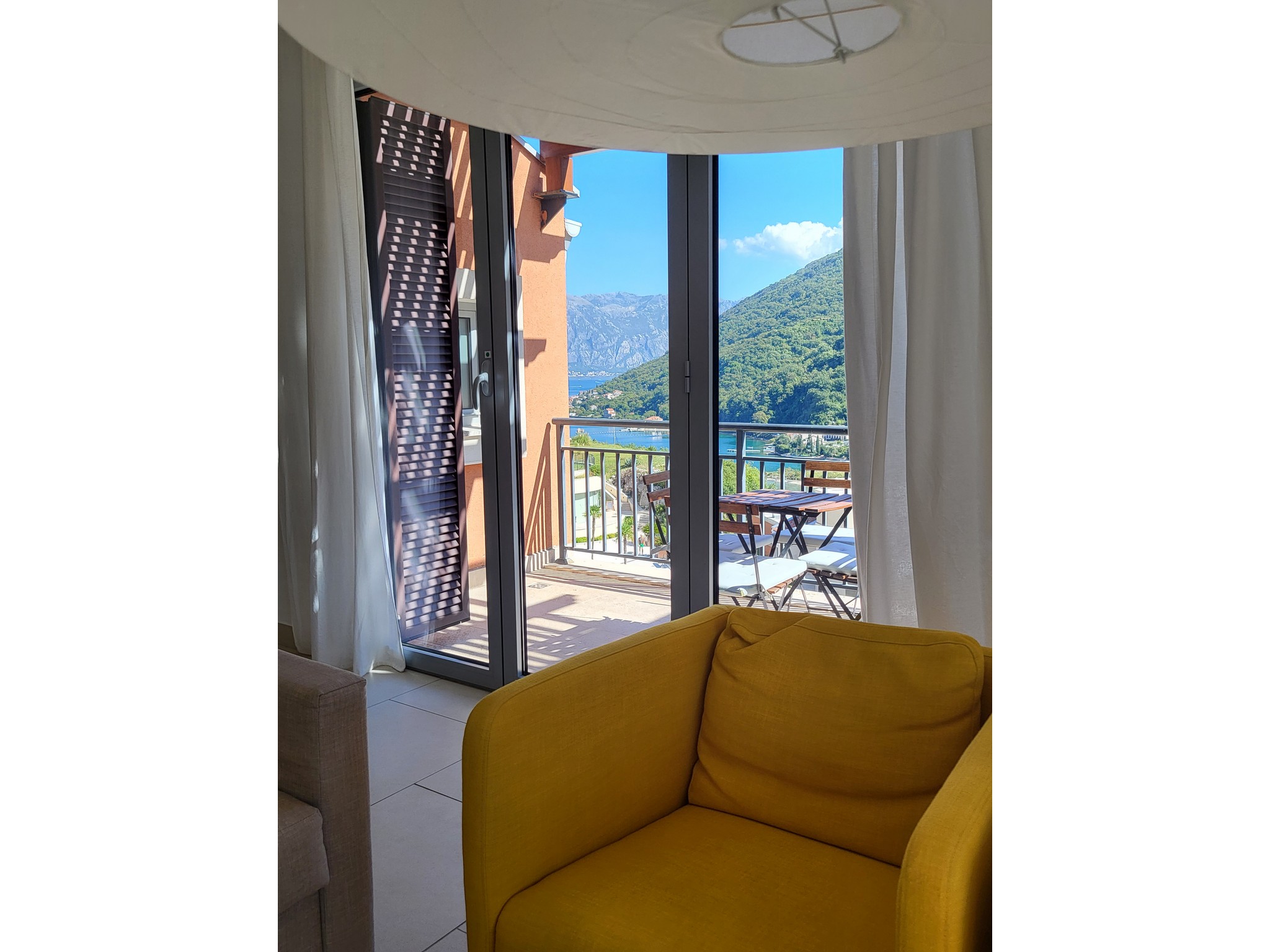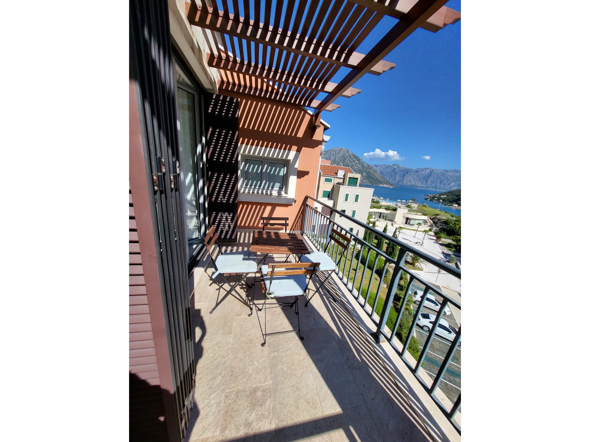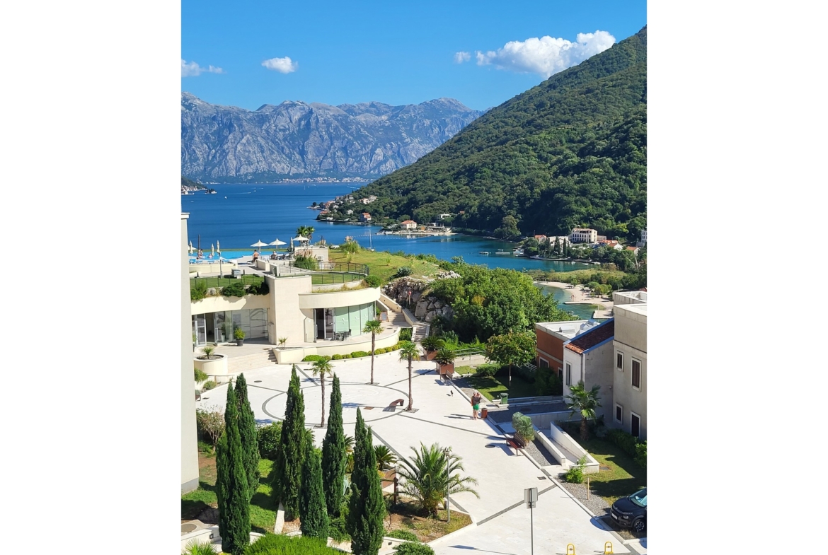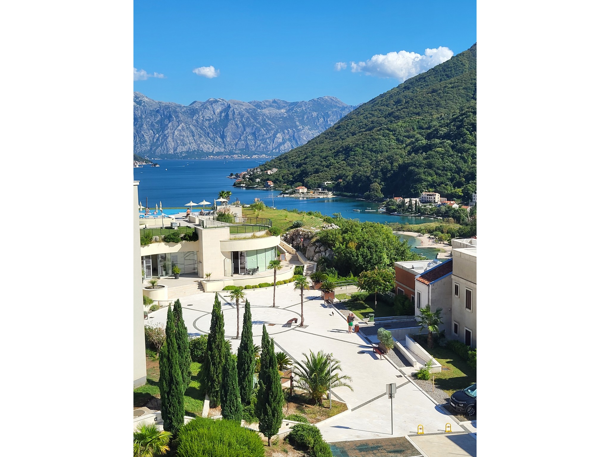 Modern beautiful complex with large shared area, one of the most beautiful complexes in Boka Bay. One bedroom apartment with great sea view! Apartment is on the second floor, has elevator. Fully furnished and fully fitted kitchen, 2 aircons, underfloor heating at the bathroom. Ready to be rented out or lived in. Allocated parking spot! Most beautiful sea view at the infinity swimming pool, absolute hi light of the complex. Spa center, very rare for complex to have-ideal for rentals-prolongs rentals and compete competition over quite rental periods. Very peaceful yet short walkig distance to the sea and short driving distance to Kotor/Tvat/Herceg Novi. Great restaurants very close by…